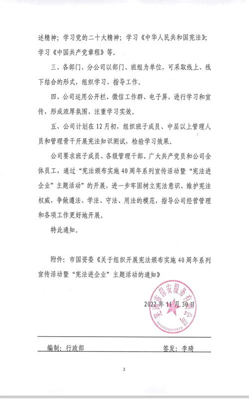 公司要求班子成员、各级管理干部、广大共产党员和公司全体员工,通过“宪法颁布实施40周年系列宣传活动暨‘宪法进企业’主题活动”的开展,进一步牢固树立宪法意识、维护宪法权威,争做遵法、学法、守法、用法的模范,指导公司经营管理和各项工作更好地开展。