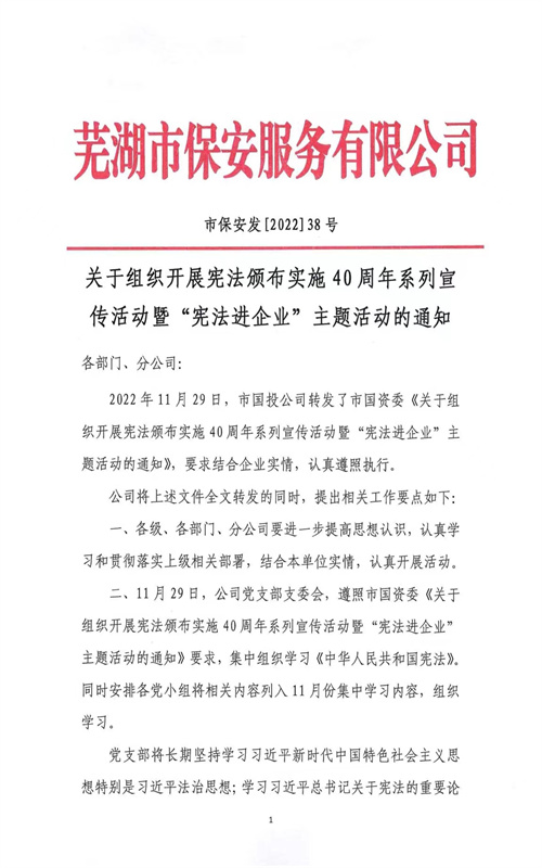 一个时期以来,在上级党委的坚强领导下,市保安公司认真组织开展宪法颁布实施40周年系列宣传活动暨“宪法进企业”主题活动,结合工作实际,在全公司范围内持续营造学习宪法、尊崇宪法、维护宪法、遵守宪法、运用宪法的浓厚氛围。